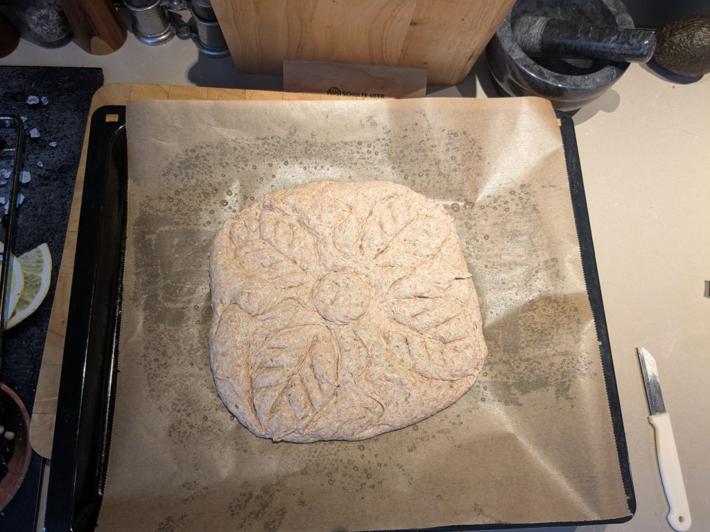 We hebben een broodbakmachine thuis, maar ik wilde eens uitproberen hoe het is om brood te bakken in de oven. Niet alleen omdat ik even lekker met de handen deeg wilde kneden (ja, dat vind ik echt heel leuk) maar ook omdat ik wilde proberen om het brood mooi te kerven. Ik heb een speltbrood gebakken met Italiaanse kruiden erin. Ik heb geprobeerd om een soort patroon met bladeren te kerven.