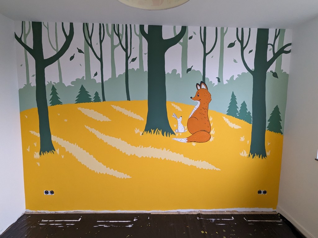 Een kinderkamer kan wat mij betreft niet fantasierijk genoeg. Een mooie muurschildering maakt een kamer meteen gezellig en geeft enorm veel sfeer. En nog leuker, anders dan bij behang kun je met een schildering echt alle kanten op! Een onderwaterwereld, de ruimte, een kasteel, werkelijk alles kan. Ik heb voor mijn eigen baby een bos geschilderd met een vos en een konijn. Als hij groter wordt maak ik met plezier een nieuwe schildering passend bij zijn leeftijd en wensen. Wil jij ook zo’n schildering in je huis? Neem dan even contact op!